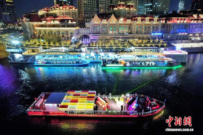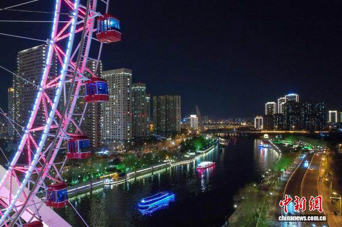府上图为旅客乘坐海河游船不雅看天津夜景。(无东谈主机相片) 记者 佟郁 摄